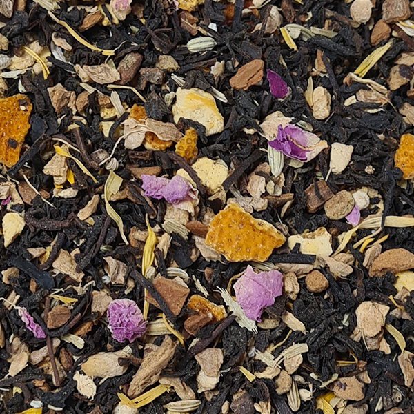 Thé noir*, épices (gingembre*,cannelle*, cardamome*, clous de girofle*, baies de genévrier*, fenouil*, poivre noir*), écorces de mandarine*, pétales de souci*, pétales de roses*. *Issu de l’agriculture biologique.